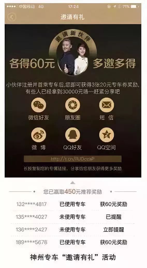 同样,租车也是传统生意,神州租车却在这其中也加入了社交裂变的元素,一个用户邀请一个好友,好友注册并首乘之后,神州就会送给老用户三张 20 元的专车券作为奖励,多邀多得。这个套路跟Luckin coffee一脉相承,因为他们负责营销的团队是同一套班底。