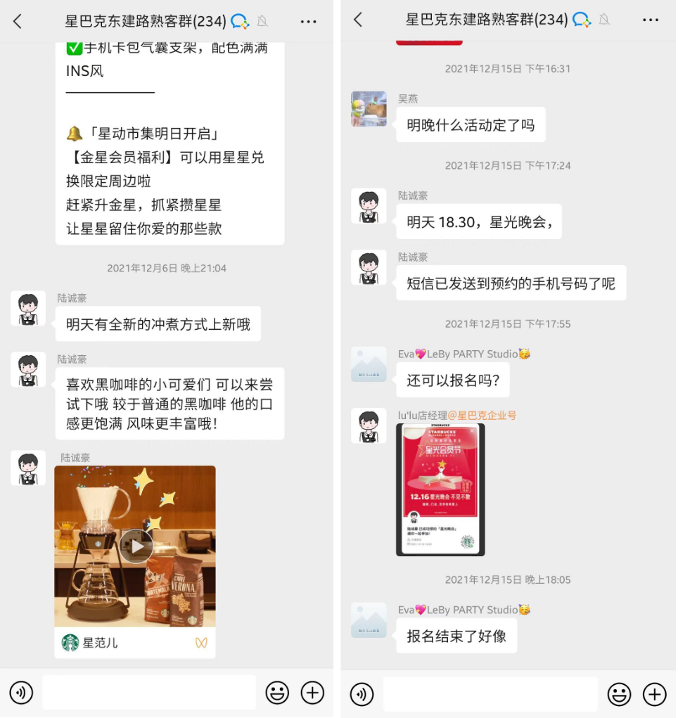 星巴克的每个门店熟客群内,都有10位左右的咖啡师在线,做有温度的服务。从问题解决、情感互动、门店活动、线下邀约至成为朋友。
