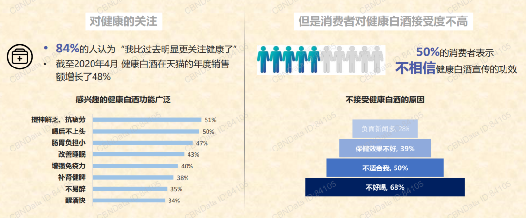 前面讲到高度酒是年轻人选择白酒的一种障碍因素,低度酒在当下正成为一种潮流,同样的健康性的白酒也正在受到大众的关注,比如一些保健酒或者主打功能性的产品。这种趋势下一方面人们对健康的关注度拉升,同样在另一方面对酒是否能对身体存在健康性持疑。