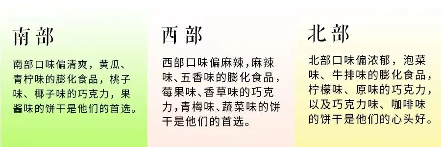 同时消费者对休闲零食的口味有着明显的地域偏好,如东部口味偏咸鲜,鲜虾味膨化食品、奶茶味、卡布奇诺味的巧克力,奶香味、海苔味的饼干是他们的首选。