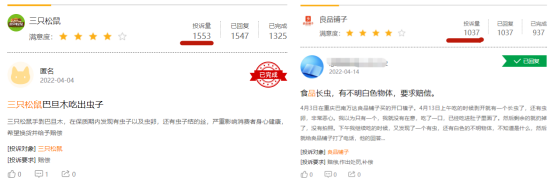 截止至2022年4月24日,黑猫投诉上三只松鼠尽显一哥风范,投诉量高达1553起,良品铺子1037起,良品铺子的“良品”二字真是耐人寻味。
