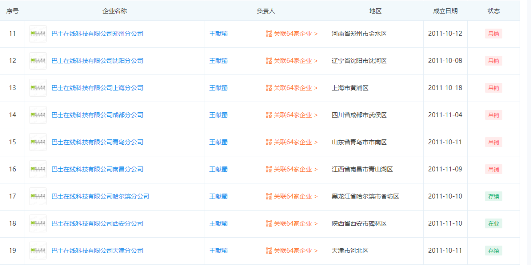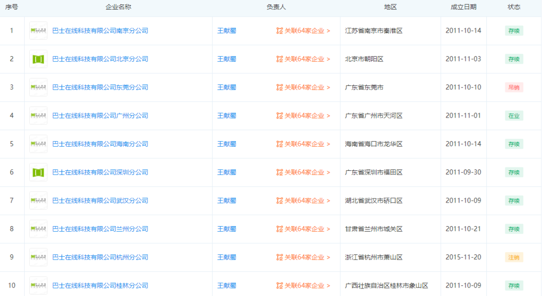 (巴士在线2011年在全国布局的分支机构 图源:企查查)