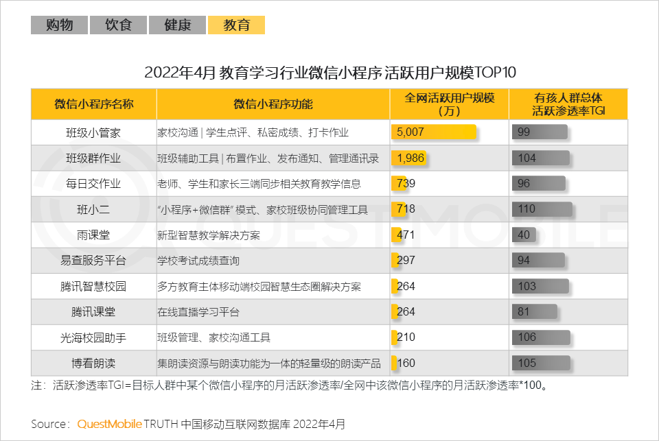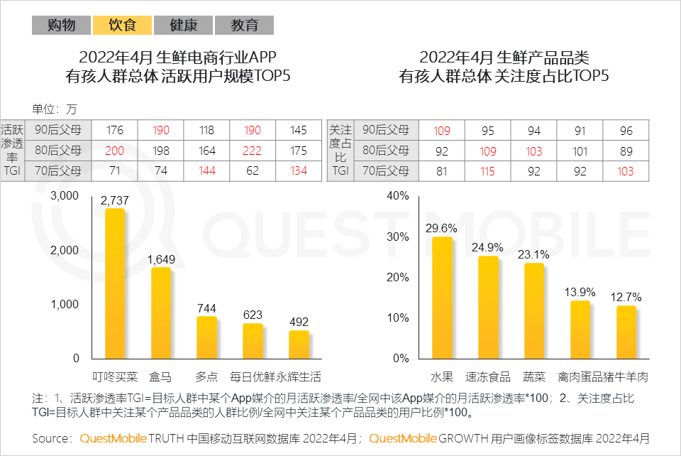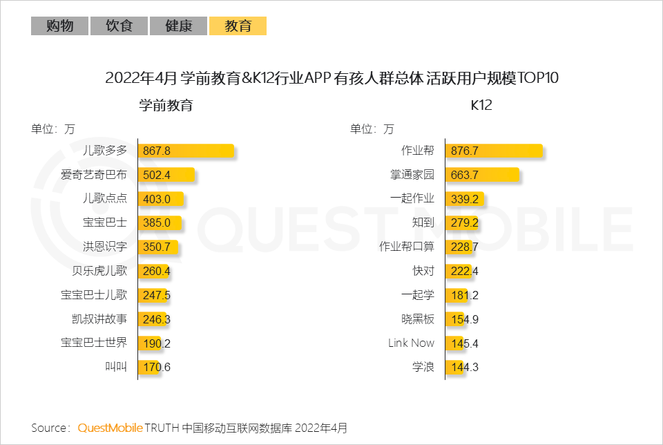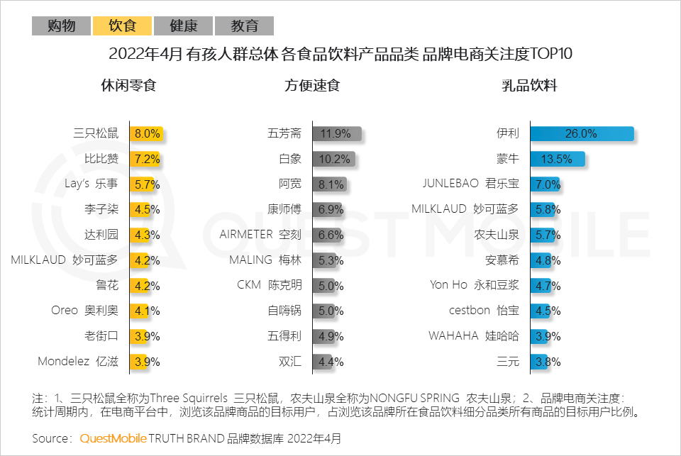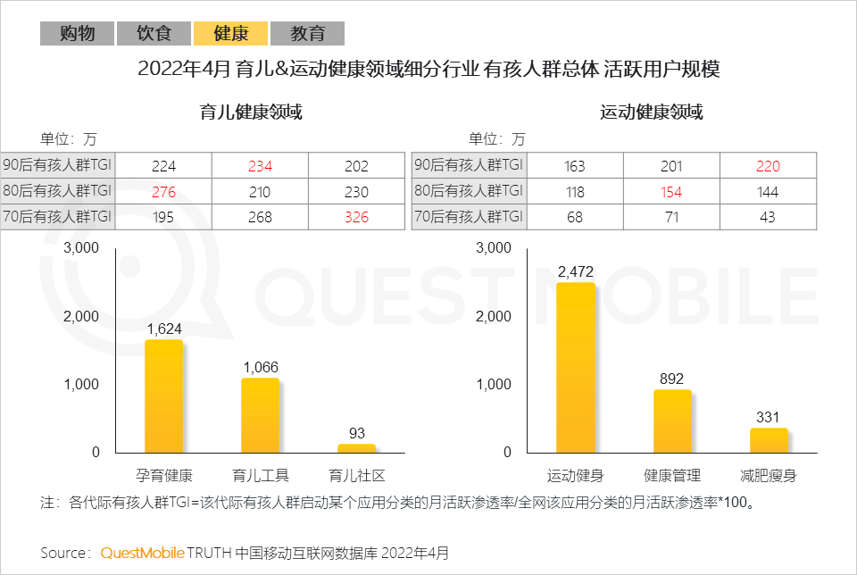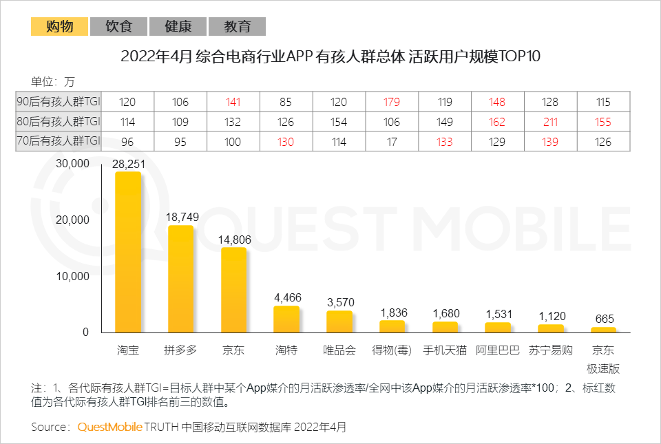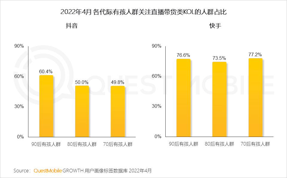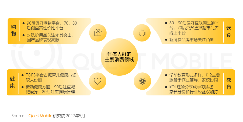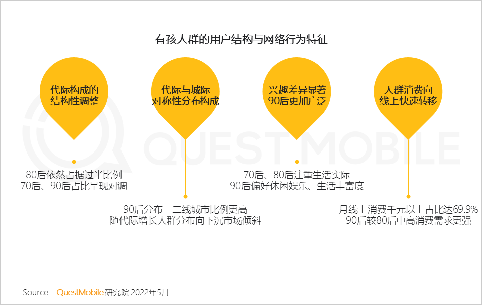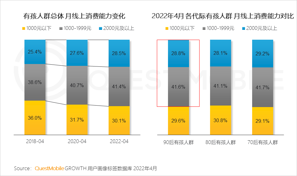 QuestMobile数据显示,2022年4月有孩人群中,月线上消费能力在1000元以上的用户占到69.9%,近5年增长5.9个百分点。