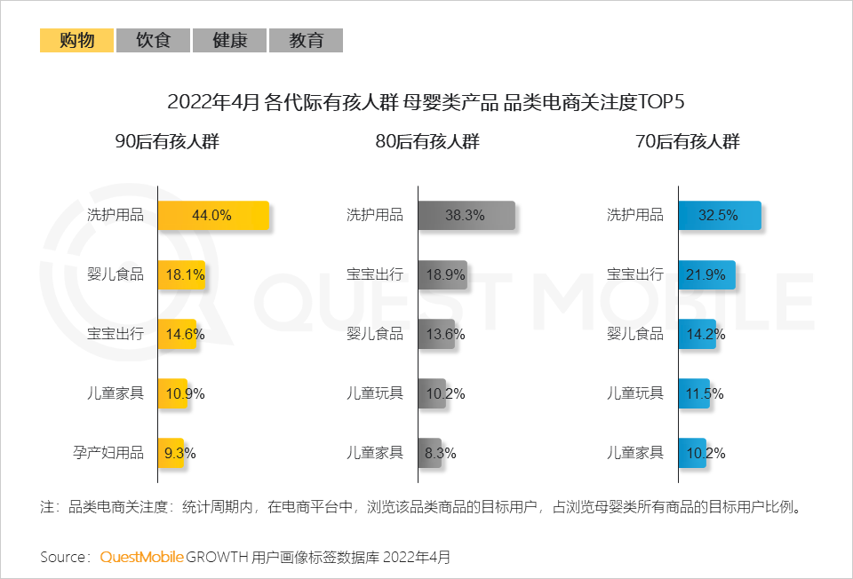 4、各代际有孩人群对于母婴类产品品类的关注基本一致,其中对于洗护用品的关注度尤其高