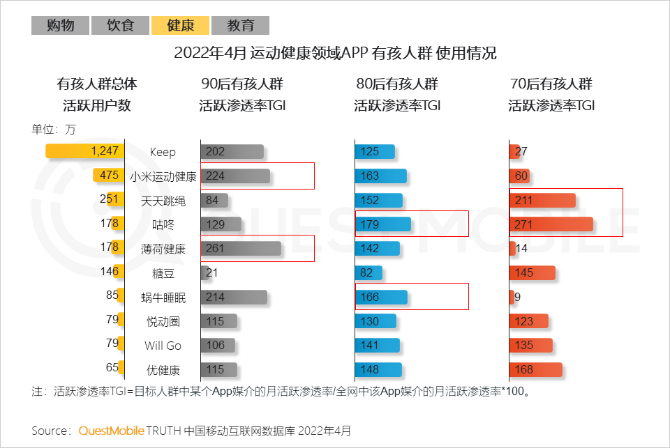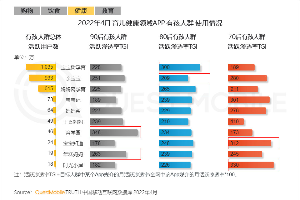 10、育儿健康领域,TOP3平台对于有孩人群市场占据较大的规模优势,不同代际人群对于平台选择倾向差异较大