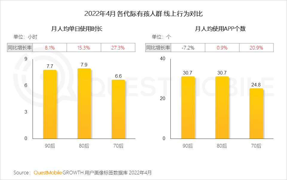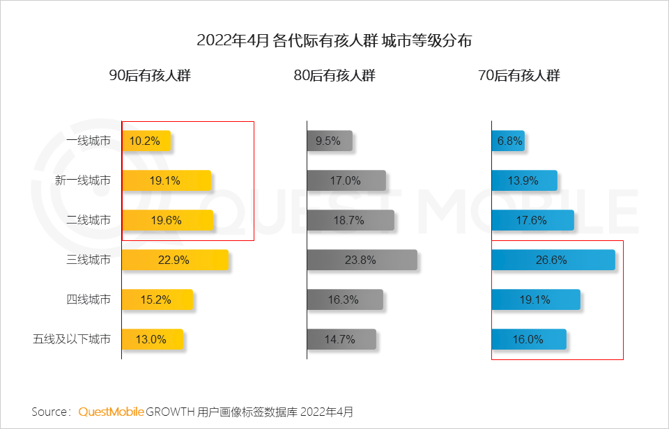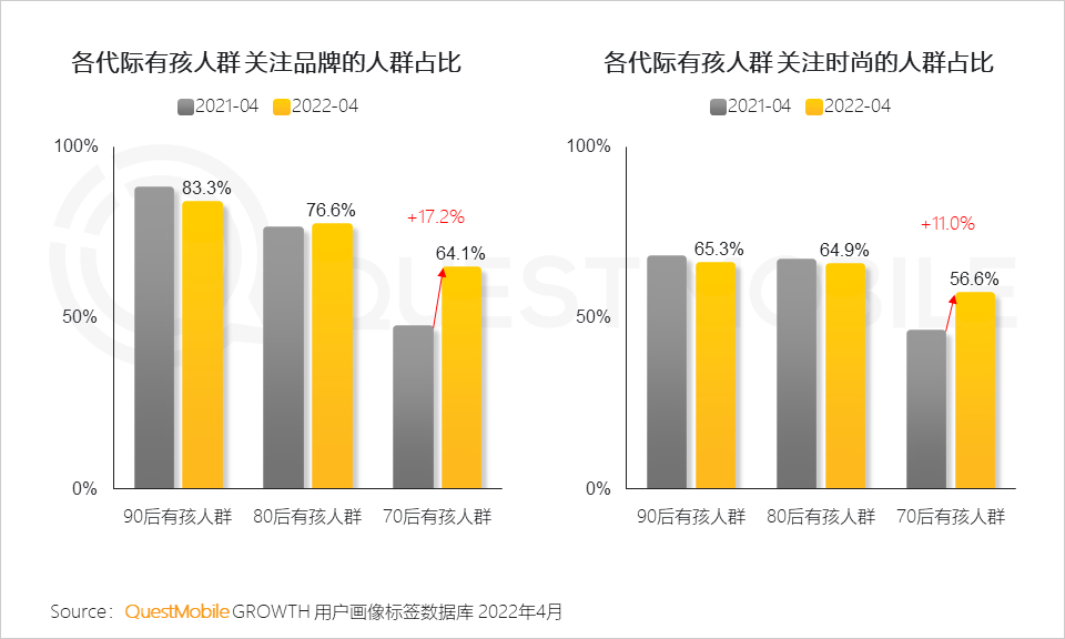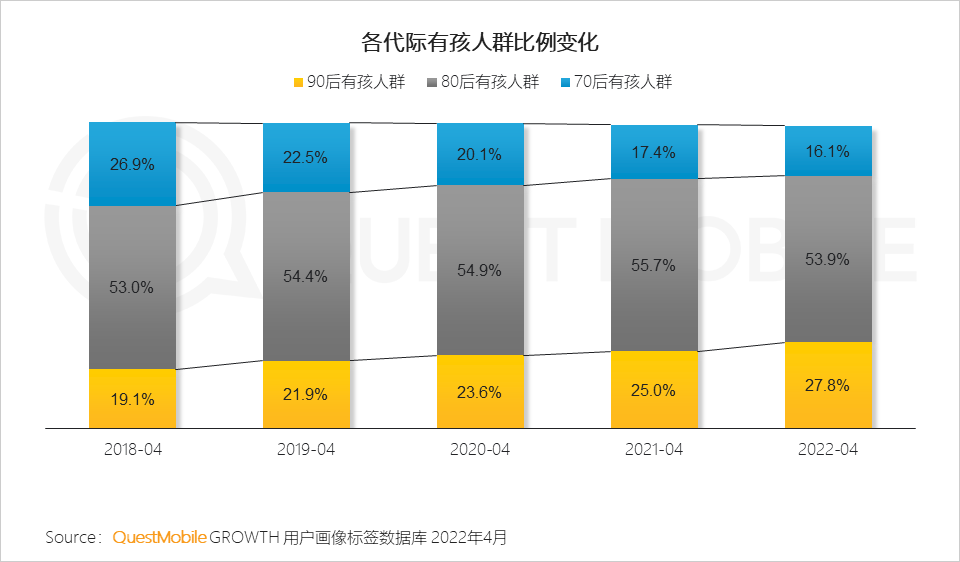 QuestMobile数据显示,近五年,有孩人群中90后占比从19.1%增长至27.8%,增长8.7个百分点,与70后占比几乎呈现对调态势。