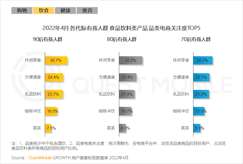7、各代际有孩人群对于食品饮料的品类关注也基本一致,80、90后对休闲零食具有较高的消费需求