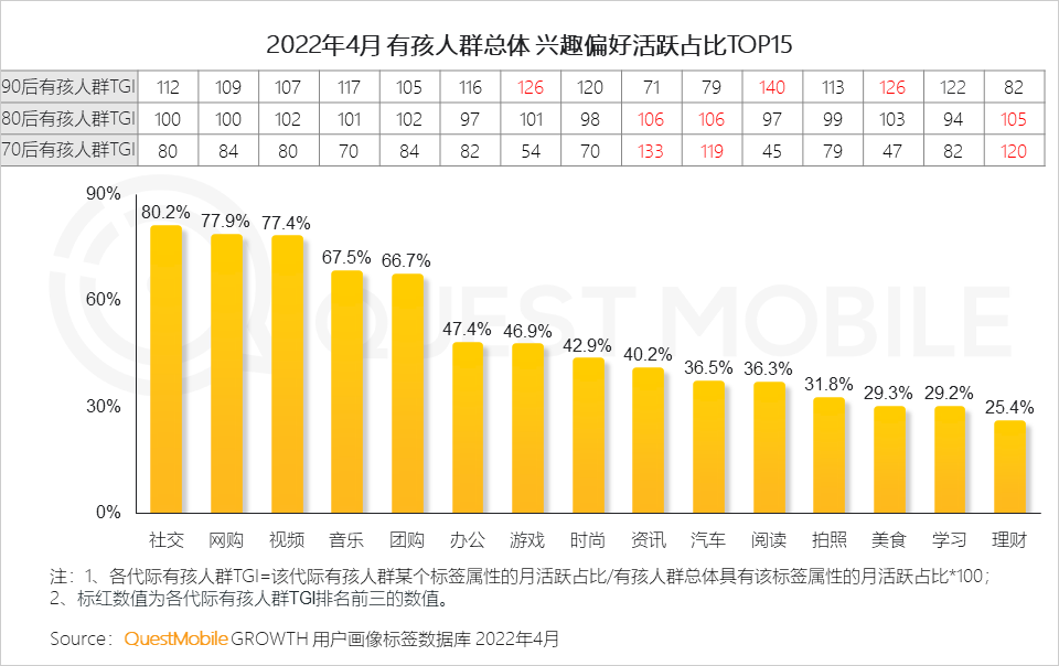 5、不同代际有孩人群兴趣差异突出,相较70、80后注重资讯、汽车、理财等关切生活实际的内容,90后兴趣更广泛,更偏好休闲娱乐,丰富自己的生活