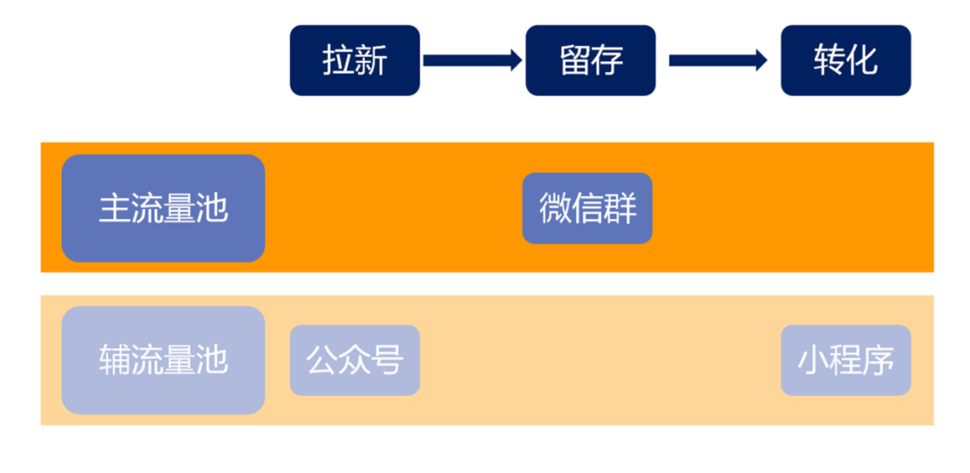 私域流量池的运营不同于社群运营,后者整个的用户路径基本上都是在一个较为明确的载体中完成,比如微信群。而私域流量池因为涉及到主流量池和辅流量池,承载流量的载体不同,所以在用户路径中的不同节点,需要依托的载体也不同。比如:以公众号作为辅流量池,主要是用来实现用户拉新;微信社群作为主流量池用来实现用户活跃和留存;而利用小程序来实现用户转化等等。