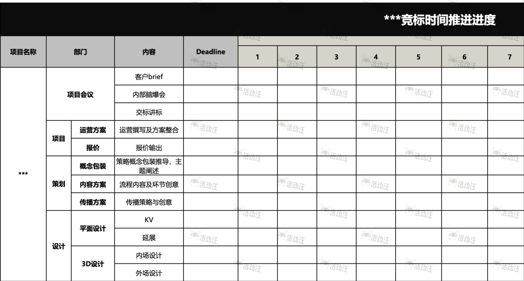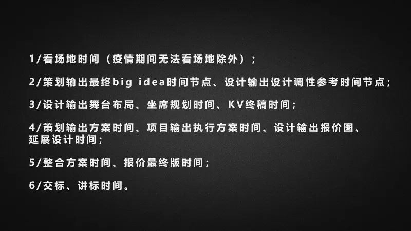 此阶段主要角色是项目经理来输出和把控。首先对于时间进度,从收到brief后到最终交标讲标,需要制定好关键时间节点,主要分为以下几个关键部分: