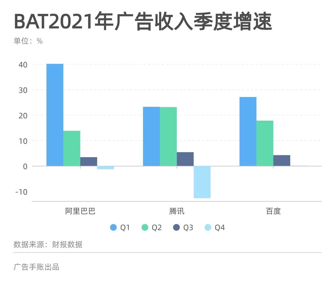 类似情况也发生在中国。4月初,QuestMobile发布的数据显示中国互联网广告市场在去年同比增长两成。但从2021年下半年开始,中国最主要的互联网广告平台都面临着业绩承压的问题。去年第四季度,BAT等头部玩家的广告业务同比增速就「断崖式」陷于停滞乃至下滑;而情况到了今年第一季度仍然没有好转,例如百度和腾讯就分别同比下跌6%和18%。