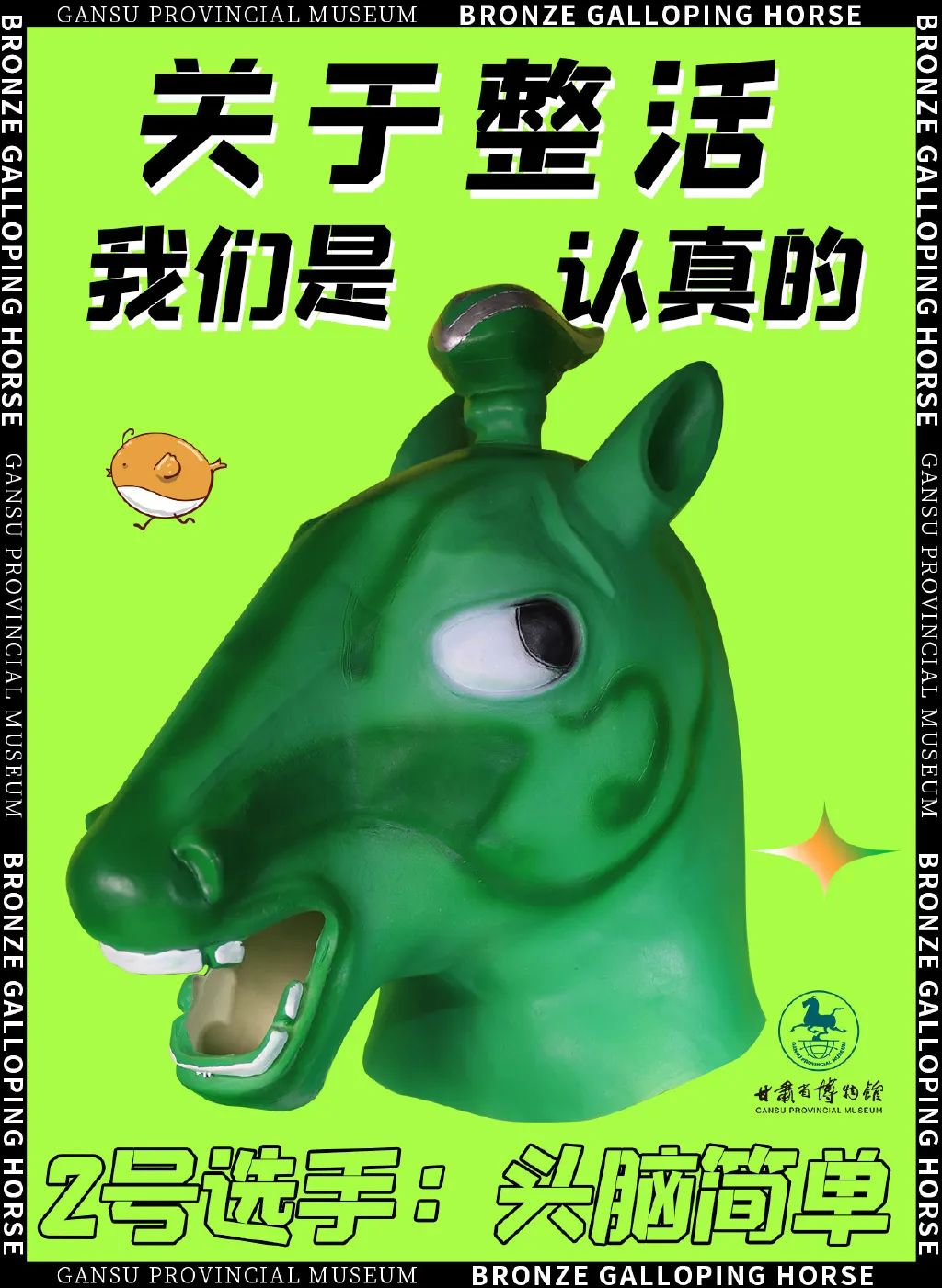 同样是抓住“铜奔马”正面自带喜感的特点,在尊重文物原型特点的基础上,设计出这款3D马头造型的“绿马头套”,并创意编排了一组“神马舞”同步亮相。