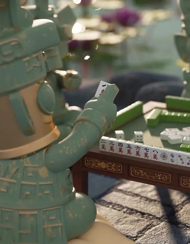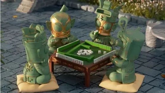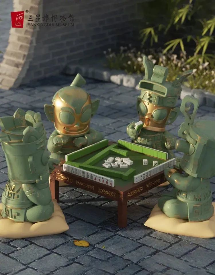 四个青铜小人坐一桌搓麻将,有的正襟危坐,有的托腮思索。这些青铜小人除了打麻将,还会玩蜀绣、功夫茶、变脸等,制造出一种反差萌的设计 。