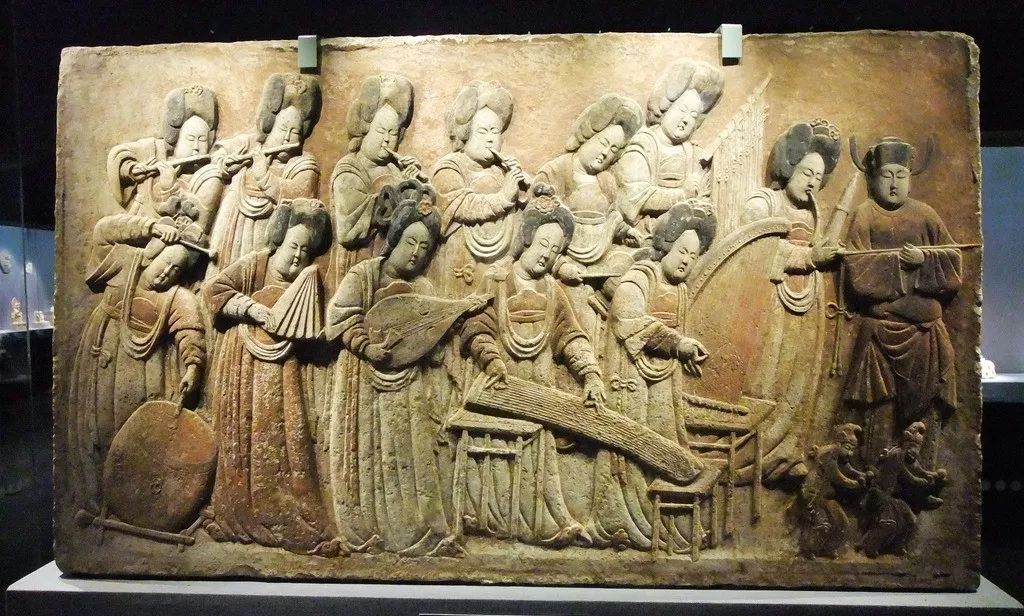 河北博物馆的墙壁浮雕,描绘的是唐代15个乐团仕女演奏的画面。