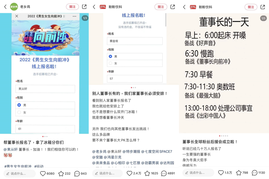 作为在微博和小红书上“皮”出名的官号,给董事长挖坑这件事,老乡鸡必然是一马当先,61岁的董事长也得去闯(落)关(水)。而受到启发的其他官号也纷纷行动起来,给董事长报上了名。像盼盼不但给自家董事长报名,还要撺掇其他品牌一起上,甚至还给董事长起后援会名字,监督老板健身做日程表。