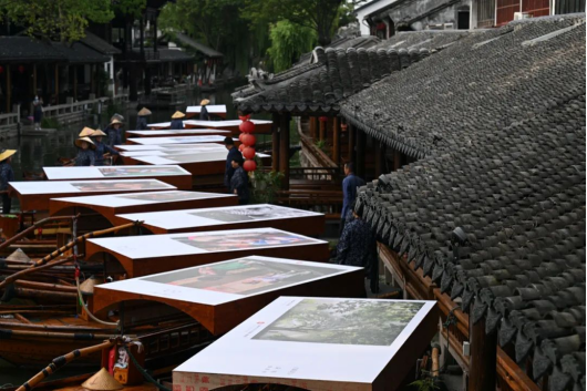 “在江南水乡的古镇河流上找一些船只,将展览办在乌篷船顶上。”尽管许多江南古镇商业化程度已经非常高,但还是一定程度上保留了原汁原味的古建筑与原住民,他们每日傍水浣衣、持桨而歌,与徕卡的人文基因存在天然的契合点。同时,日夜流逝的河水也让人想起时光,摄影定格下的“永恒瞬间”,正是为了对抗时间之河。