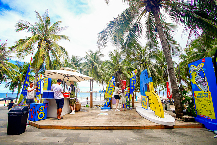 又如万宁的市集,选在了GROM日月湾冲浪店。面朝椰林和大海的日月湾,冲浪、滑板、机车、咖啡、音乐,每一个沙滩元素都满足了年轻人对美好夏日的幻想。在冲浪人的大本营摊开玩儿一把飞盘,乘势感受沙滩凉风,有什么比这个更让人过瘾呢?