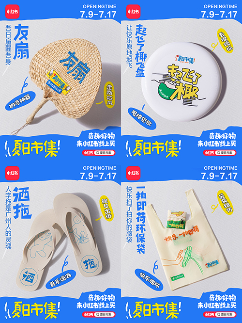 小红书此番线下市集的成功,不仅体现在选址、摊位设计、互动玩法上与城市特色高度融合,还体现在平台对各个城市文化与生活的真切洞察,就连创意周边和文案也结合线下市集的氛围。比如,大玩谐音梗的“友扇”(寓意友好的蒲扇)和“洒拖”(寓意洒脱的拖鞋),“不以扇小而不为”和“是拖不是托”的周边产品文案,无不展露出小红书在与社区年轻人沟通和氛围打造上的游刃有余,吸引越来越多的顾客到线上挑选更有意思的“奇趣好货”。
