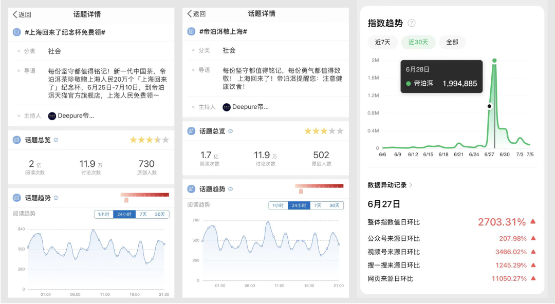 通过时空环境的高度共振,引发上海人民强烈共鸣,迅速打响了帝泊洱在上海市场的知名度与认知度。截至发稿,#上海回来了纪念杯免费领# #帝泊洱敬上海# 话题阅读量累计达3.7亿,讨论量达11.9万。微信指数「帝泊洱」呈高速增长。