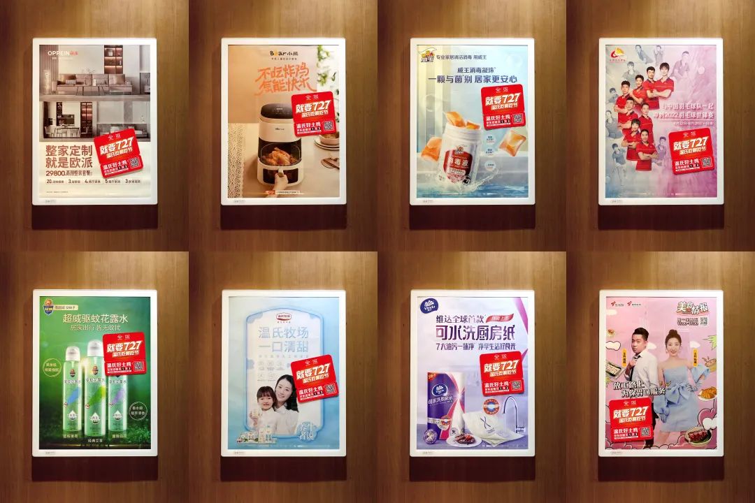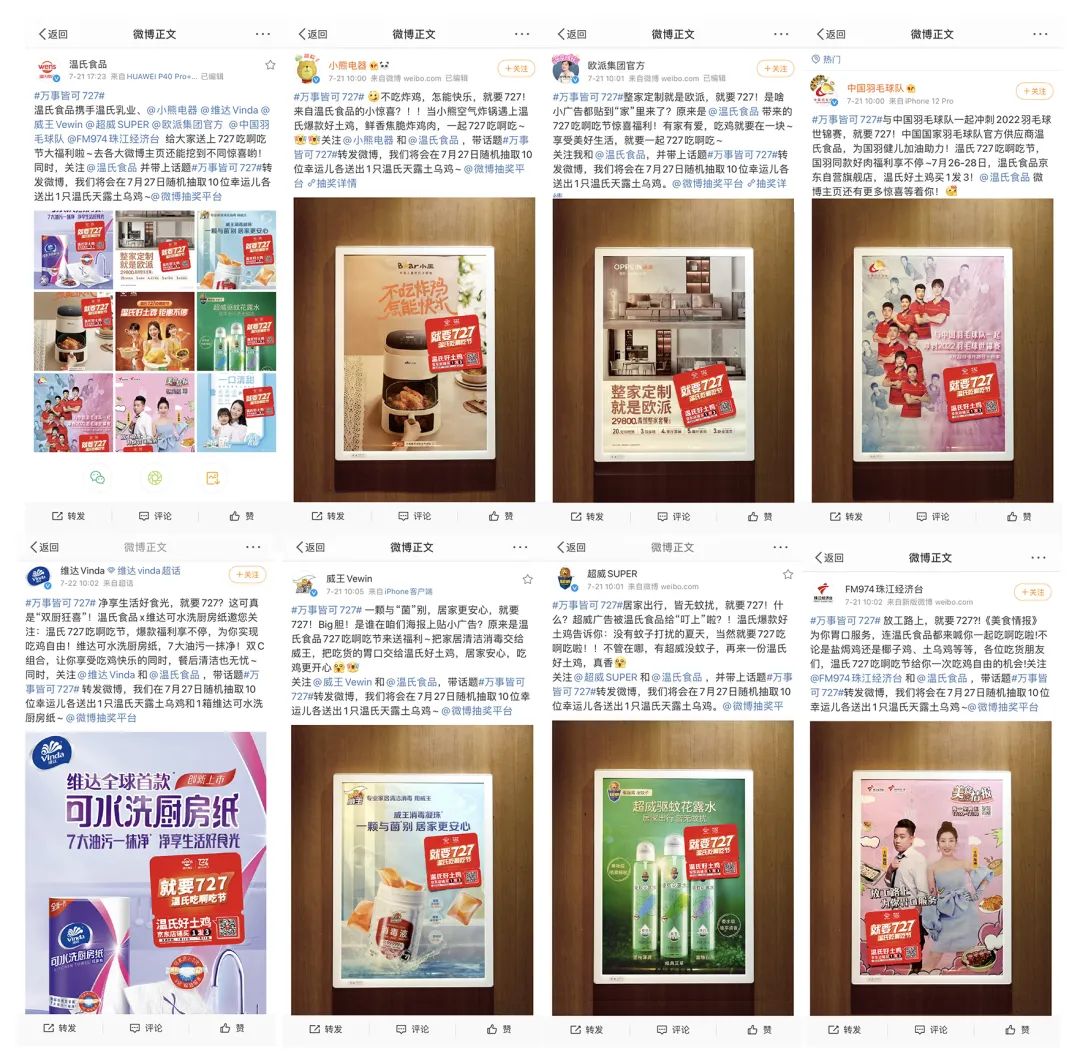 除了”碰瓷“,温氏食品此次携手众多知名品牌——国家羽毛球队、维达、欧派、威王、小熊电器、超威、广东电台、温氏乳业。线下联动在电梯媒体打造贴纸广告创意事件#万事皆可727#,线上在微博平台与多个品牌蓝V共同发声,一同打响本次造节营销战役的第一枪。