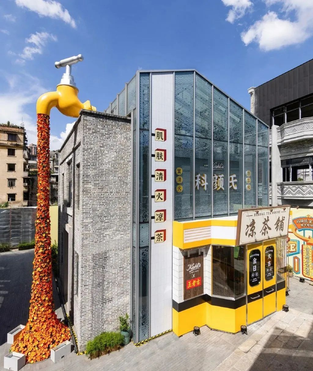 今年,有关于酷暑的天气话题不断,科颜氏和王老吉借势跨界联名,携手推出了一场名为“今日大吉”的活动,在广州永庆坊内开了一家快闪店,打造限时“金盏花凉茶铺”,呈现视觉与产品融合的清凉打卡点。整个店铺呈现国潮风的设计,店铺在入口处设置了巨型金盏花喷泉,室内不论是环境装潢亦或是元素装点,都趋近于老广茶室的feeling。