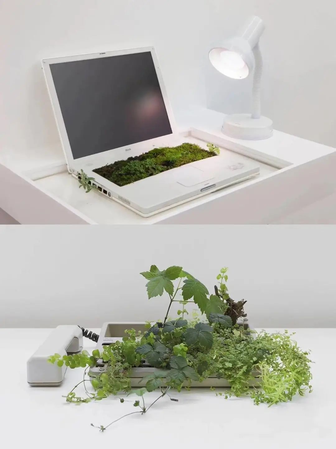 法国艺术家MichelBlazy就从这一点入手,通过呈现长草的电脑、发芽的电话等作品,暗喻大自然重新侵占、修复了人类文明造物,从而揭示生命和生态循环的永恒。