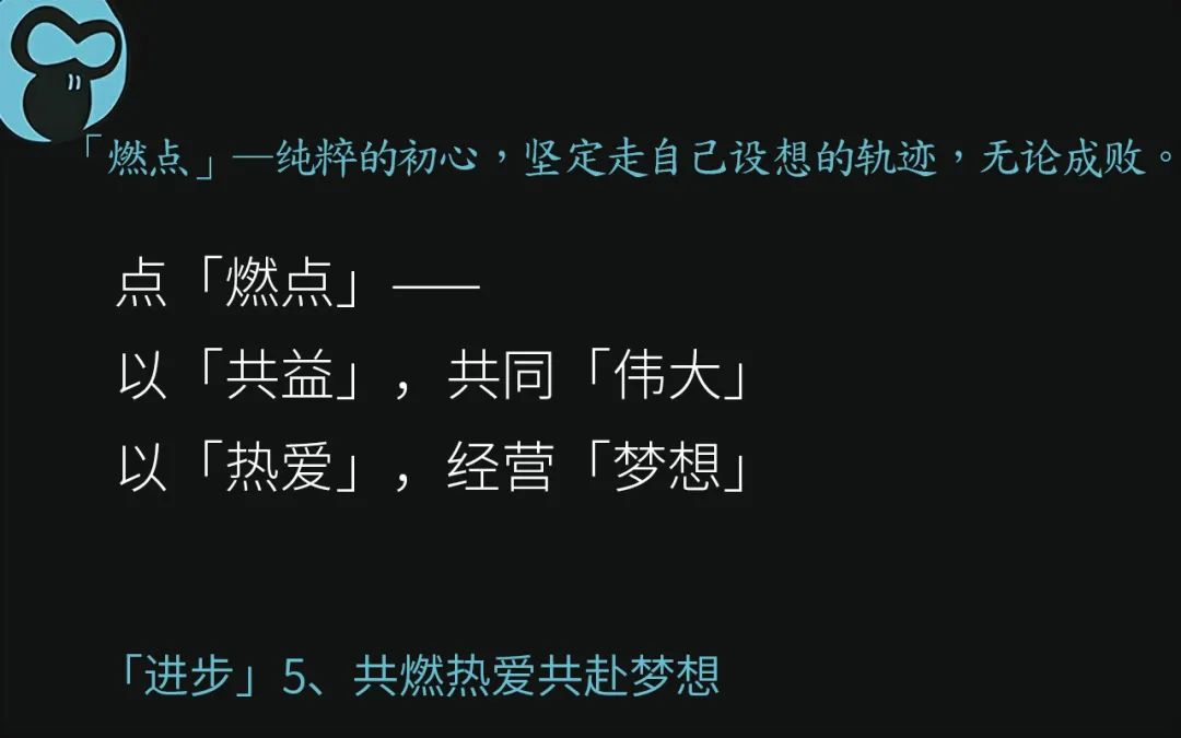 以「燃点」出发,无论是「共益」还是「热爱」,不需要考虑用户,不需要考虑风口,而是从自己出发,以价值观和热爱点燃,当然需要溶解于数字之中,否则真是“没有开始,就结束了”。