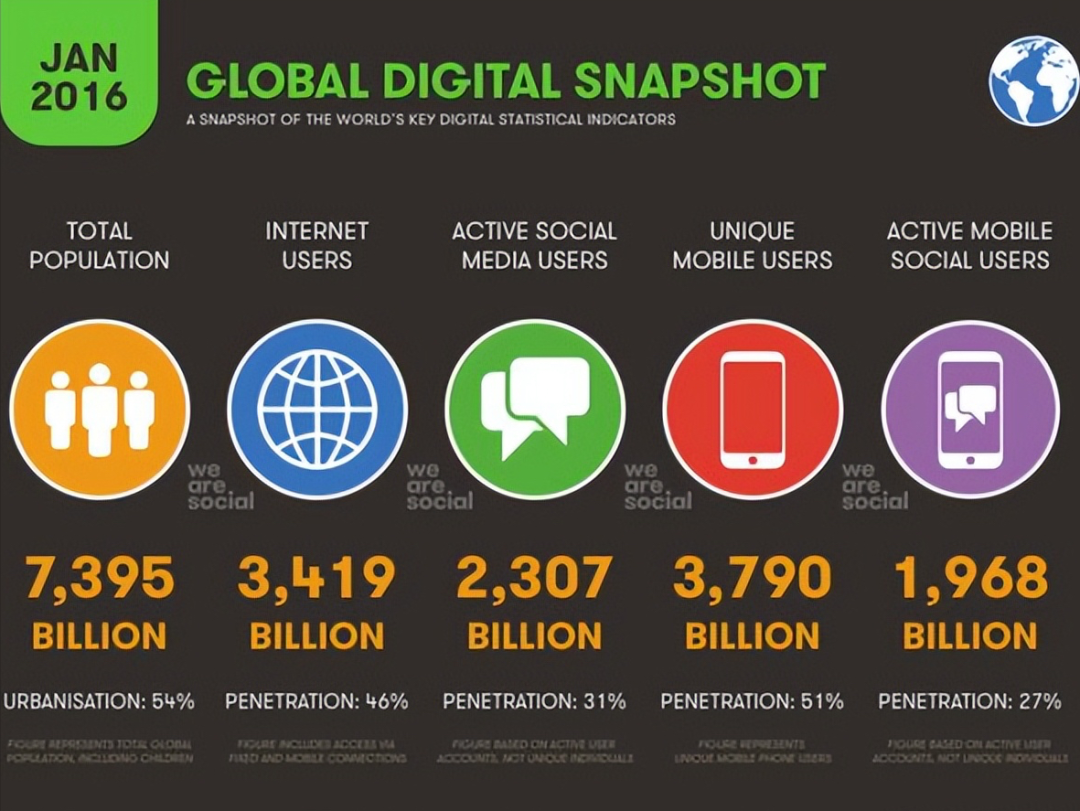 2016年,全球网民达到34.2亿人,社交媒体用户23.1亿人,手机用户达到37.9亿人;移动社交媒体用户19.7亿人,占全球人口的27%。