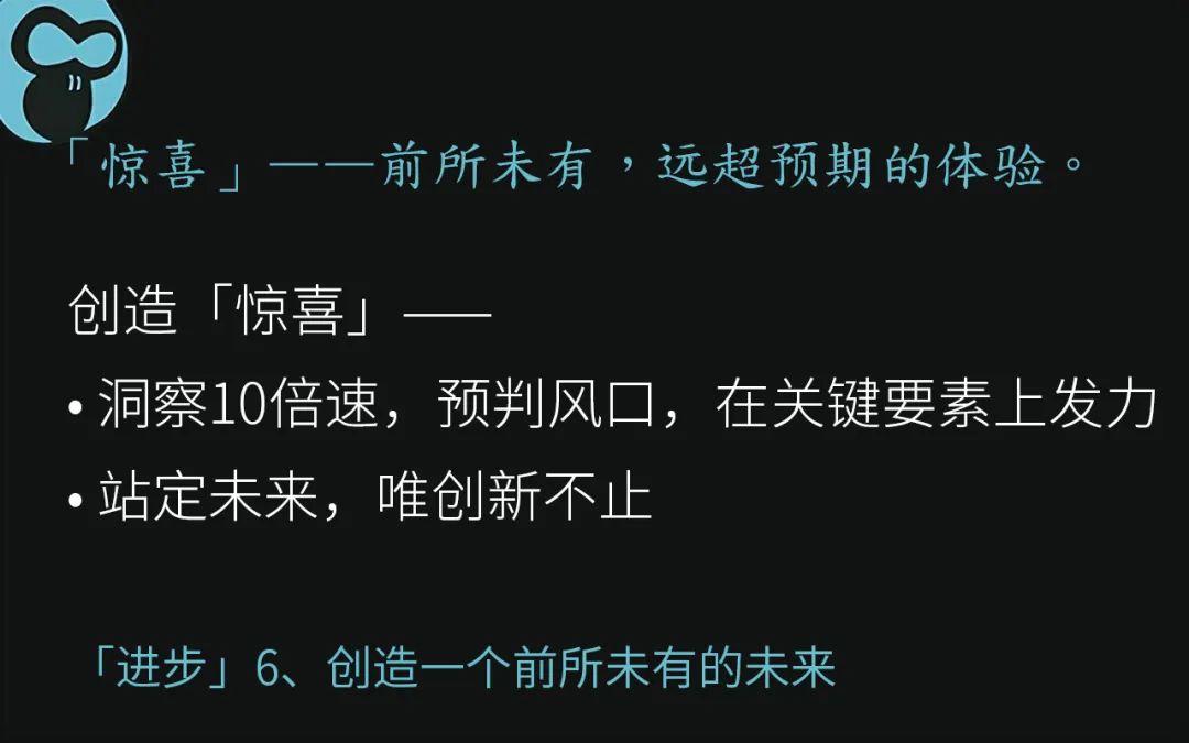 「惊喜」早已跳出了用户思维,不是用户需要什么我们创造什么;也不是以什么体验价值为用户生活赋能;更不是我们以什么极致产品销售出去得营销思维;而是以自信的使命感,笃定的信念,去创造一个前所未有的未来。