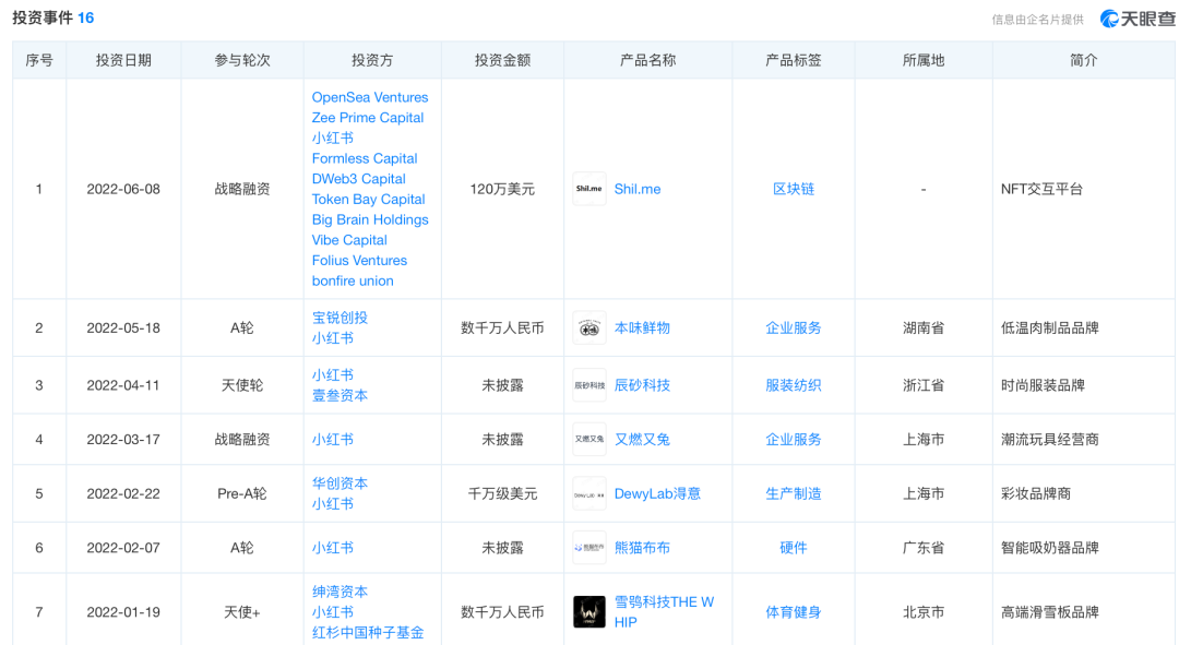 据天眼查显示,小红书共有 16 次投资事件,不仅涵盖了美妆、潮玩、服装、母婴等小红书主推的产业,还包括了速食、低温肉等新领域,最近一次投资是 6 月份的 NFT 交互平台。
