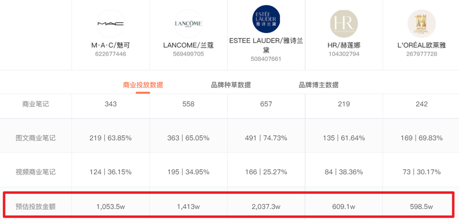 比如去年双十一前,仅 30 天,下面的 5 个美妆品牌在小红书的投放金额,就达 500w +,雅诗兰黛甚至投放了 2037w 元(数据为平台预估):
