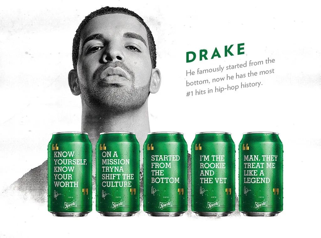 2010年,雪碧开始与加拿大说唱歌手 Drake 合作,当时 Drake 刚刚发售了最受欢迎的专辑「So Far Gone」,五年之后逐渐成为了超级巨星。多年来,雪碧总是大胆合作新人,眼光十分独到。