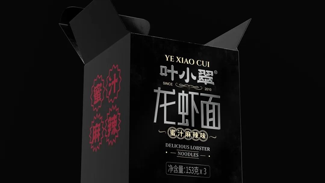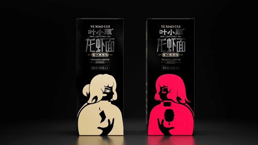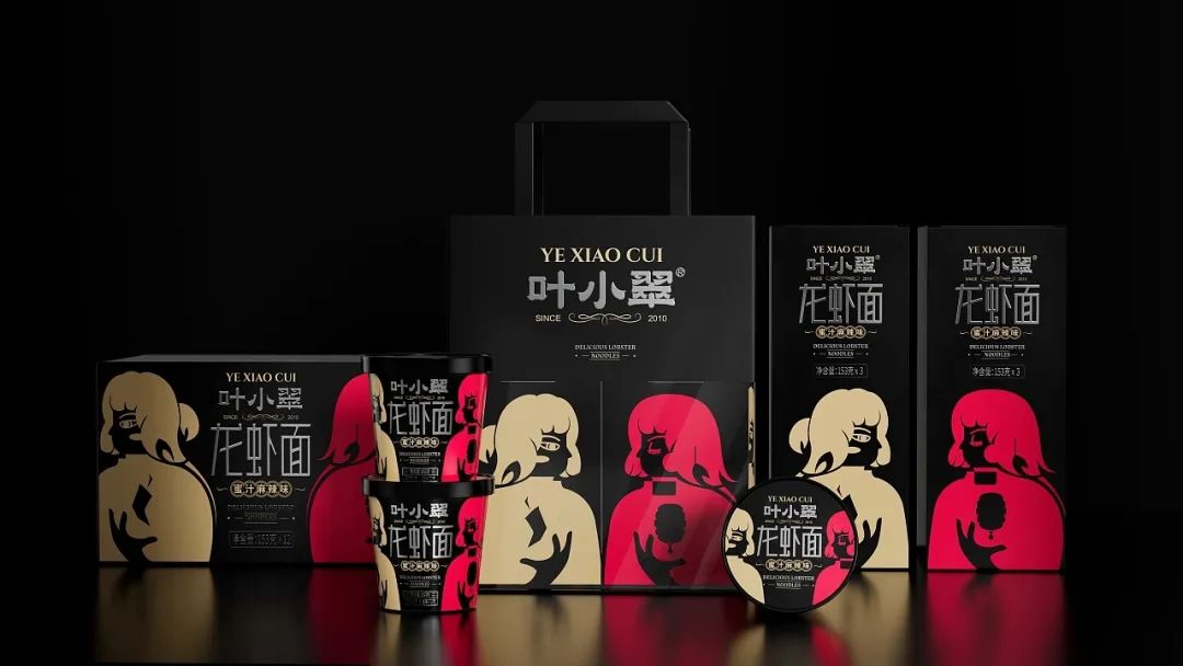 “幸福,就是饿肚子的时候能吃到一碗热乎乎的虾尾面”!叶小翠出品的泡面系列,便以小龙虾为特色,将泡面的香与龙虾的鲜、麻辣等口感相结合,刺激味蕾,让人回味无穷。设计上,整体采用国风插画的形式绘制出小龙虾威严、霸气的一面,辅以传统祥纹元素以及浓烈的色彩,打造强烈的视觉效果。
