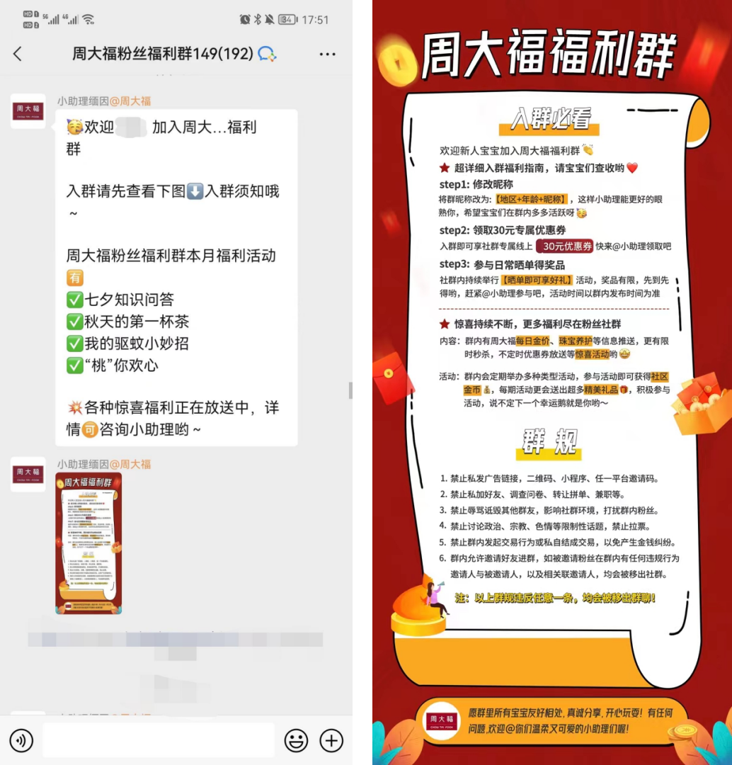 用户入群后会第一时间触发自动欢迎语,介绍社群福利活动以及社群规则。
