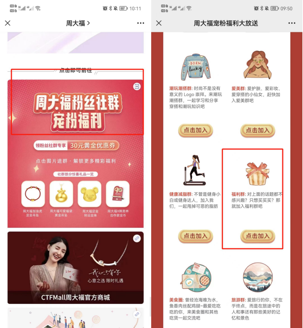 周大福设置不同类型的社群,包括爱喵群、爱美群、潮玩穿搭群、美食健身群等。从多角度、多思维、多渠道分析消费者喜好,消费者可按照自己的喜好进群,提升了消费者好感度.