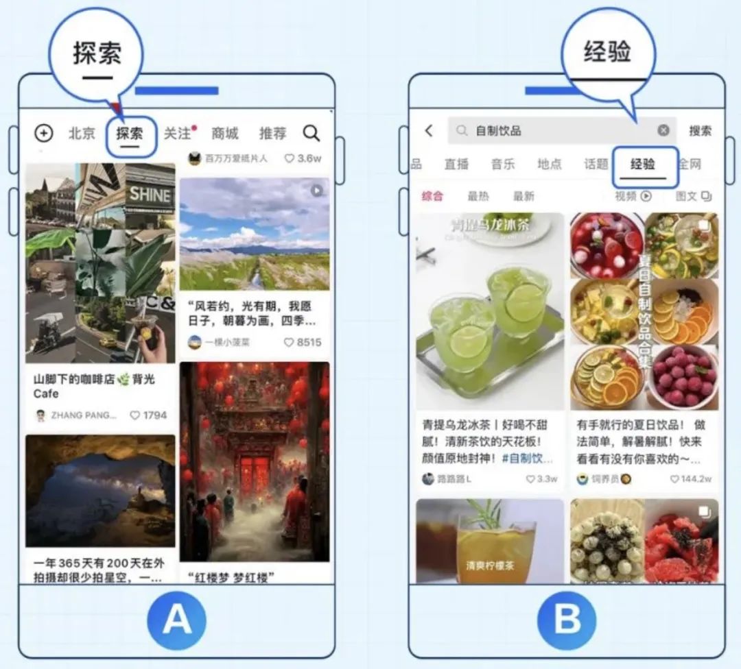 据悉,抖音目前已经在图文兴趣用户首页内测“探索”一级入口,双列分发图文内容,加强“推荐”页和“搜索”页的联动。同时,当用户在站内进行关键词搜索时,“经验”Tab栏中也将增加图文双列分发场景。