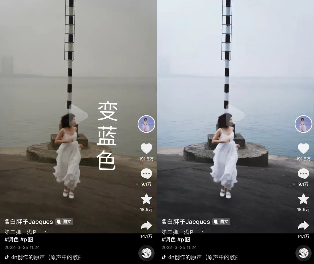 在评论区,不少粉丝询问拍摄细节,比如用什么相机、怎么调参数、如何选景找角度等,这些需求也为“白胖子Jacques”提供了选题灵感。今年3月,“白胖子Jacques”发布了一组调色前后的对比图文,将原本平平无奇的“废片”,调整成出彩的“大片”。获得了191.6万点赞。