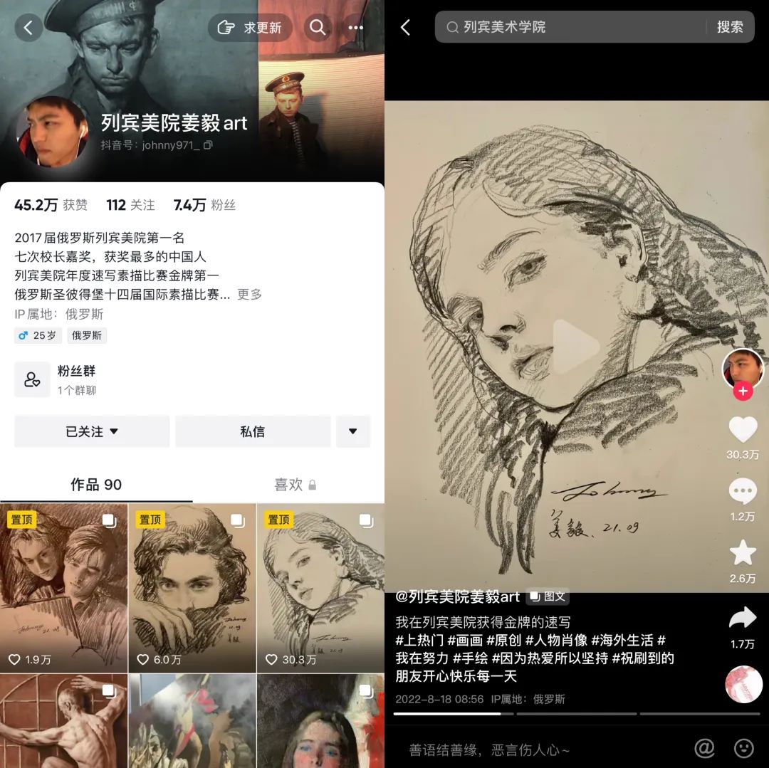 “列宾美院姜毅art”是一名在俄罗斯留学7年的美术生,在多项国际素描比赛中屡获第一,他喜欢用摄像头记录自己画下的过往作品,但由于平时忙于求学,即使是发布抖音视频,他采用的多是静态图片展示,或者是平铺直述的拍摄,没有加入技术性的剪辑技巧。