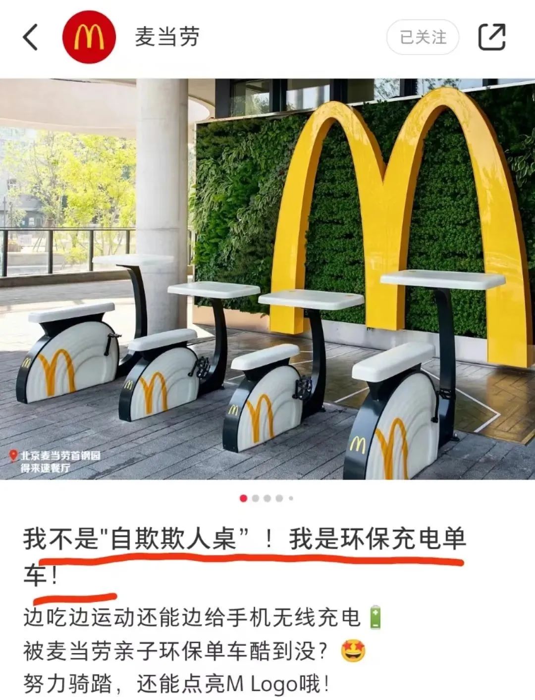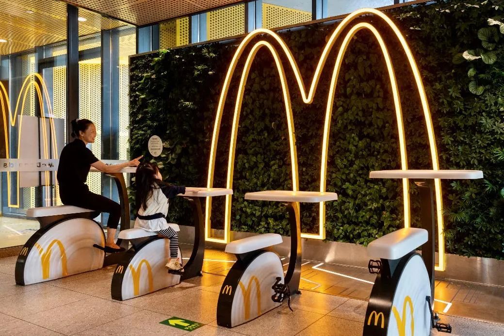 这次自欺欺人桌升级了,通过骑踏可以点亮前面的M logo,增强了时实互动感,一定程度上可以提高用户参与度,或许这也是麦当劳想要践行绿色的小心机。