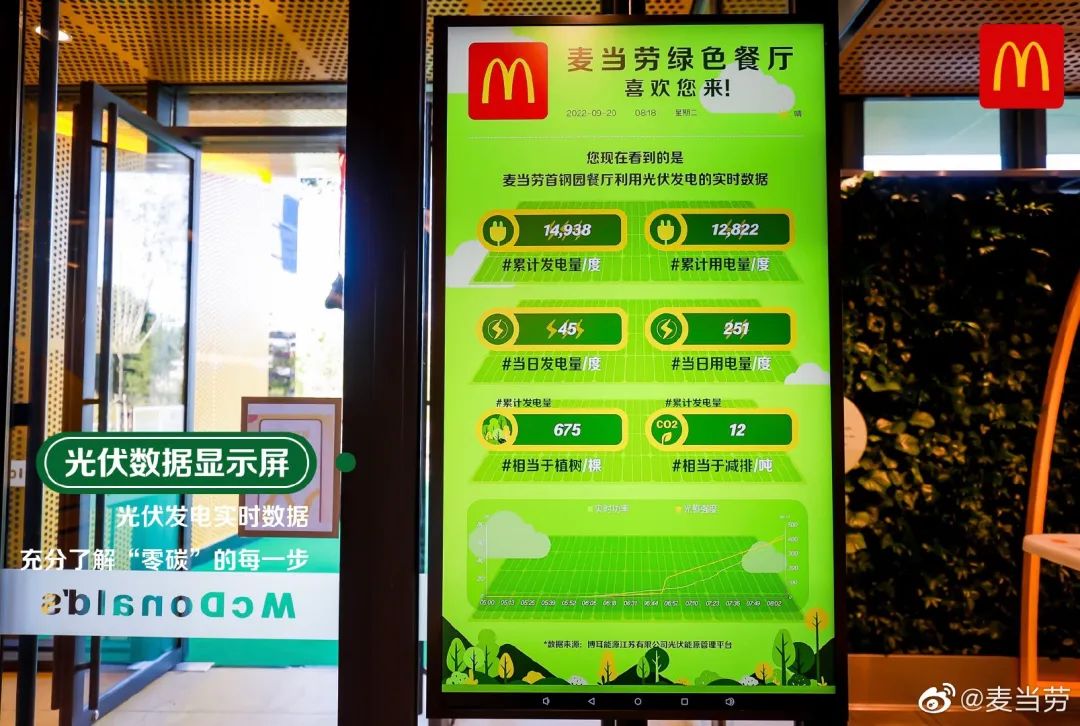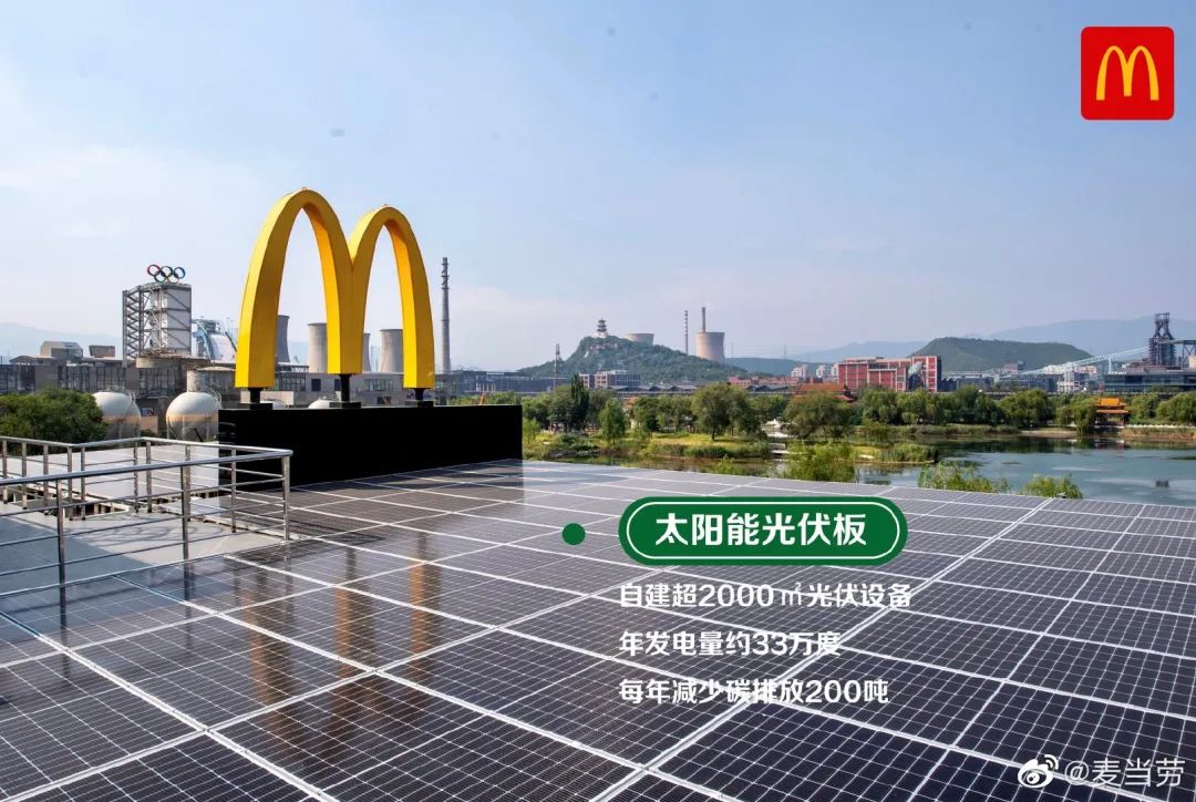 虽然这家麦当劳照片上看起来像秃噜个头,但最厉害的其实就是这部分。餐厅在屋顶自建超2000平方米光伏,据说年发电量约为33万度,日常充电自给自足,每年可减少碳排放200吨。