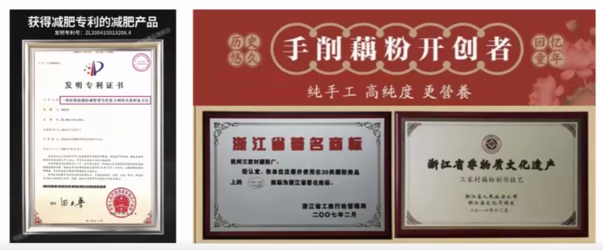 比如说浙江省著名商标,比如说非物质文化遗产,这一些的牌匾,从国家层面从政府层面给你做背书,其实在整个行业来说是比较稀缺的,这种稀缺的信息证明材料同样可以暗示消费者我说的都是真的,因为你从这些材料上就能看出我的品牌值得你信赖。