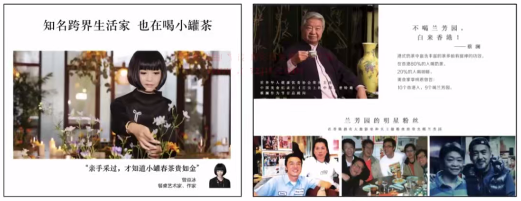 我们可以看到小罐茶找了一个艺术家找了一个作家来告诉消费者,他们也在喝这个小罐茶。还有这个兰芳园,像蔡澜、周润发这些明星大咖,也在消费这个品牌的东西。