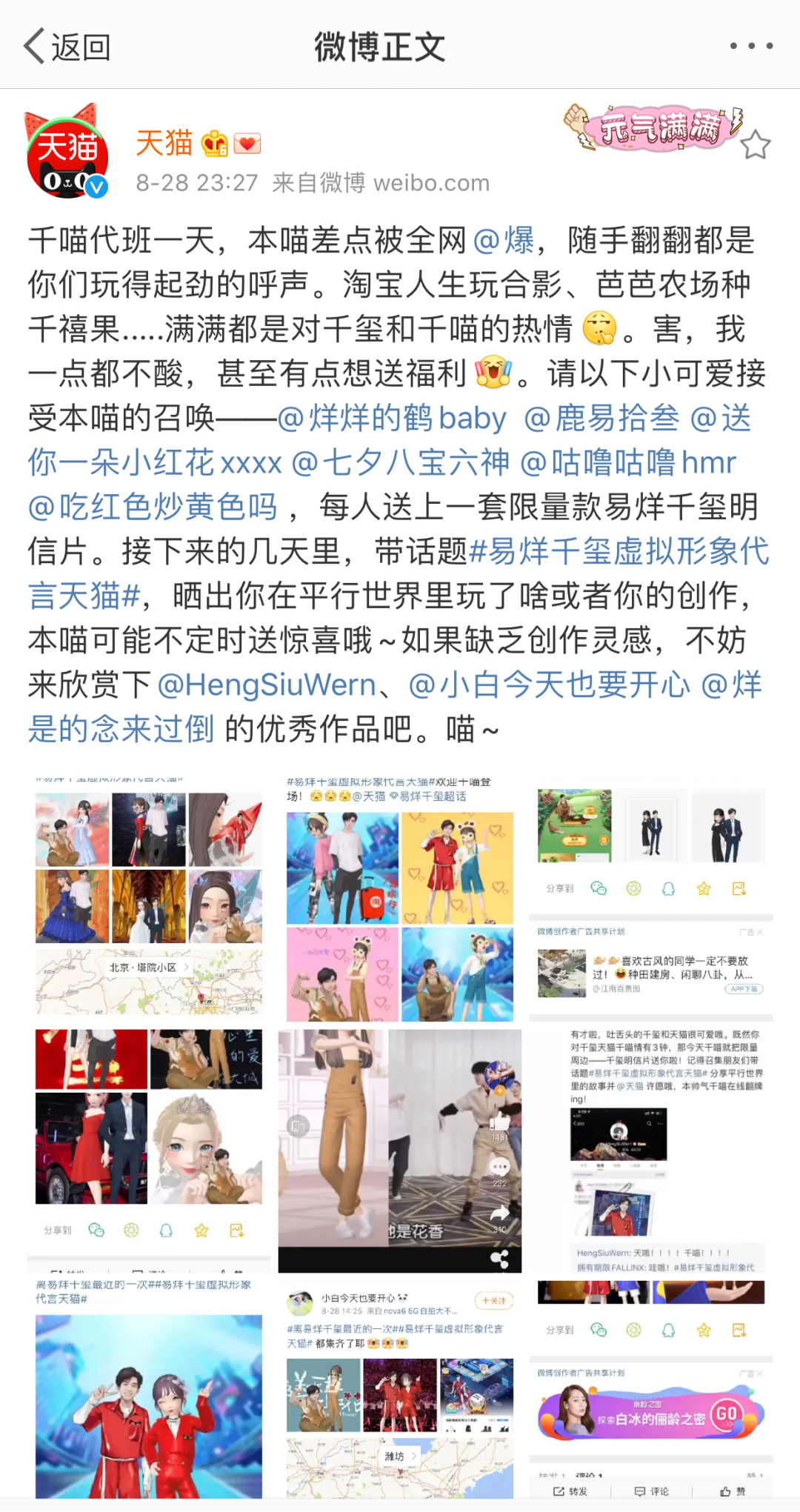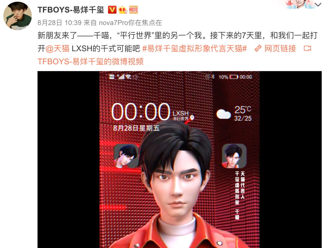天猫正式官宣“千喵”加入代言人阵容 当天,易烊千玺 的粉丝们毫无意外地”攻陷”了天猫的官方微博。