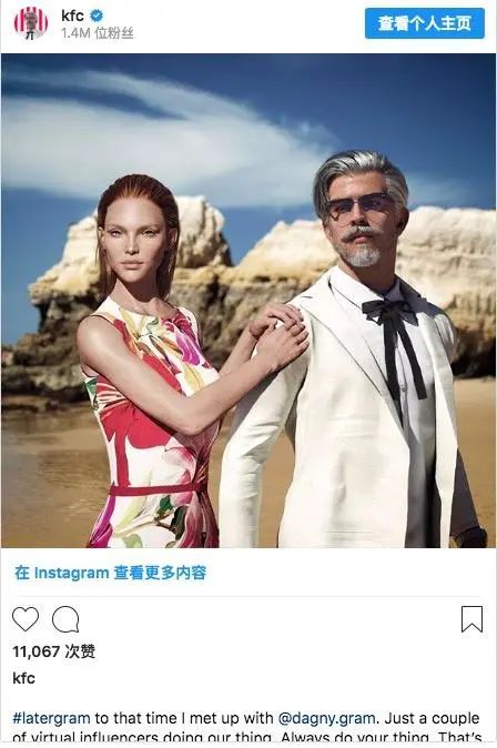”桑德斯上校“ ,是由肯德基在Instagram上推出,用CGI技术合成的品牌“虚拟形象”。