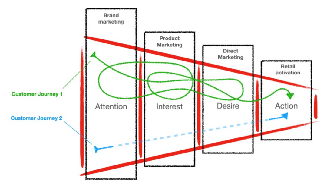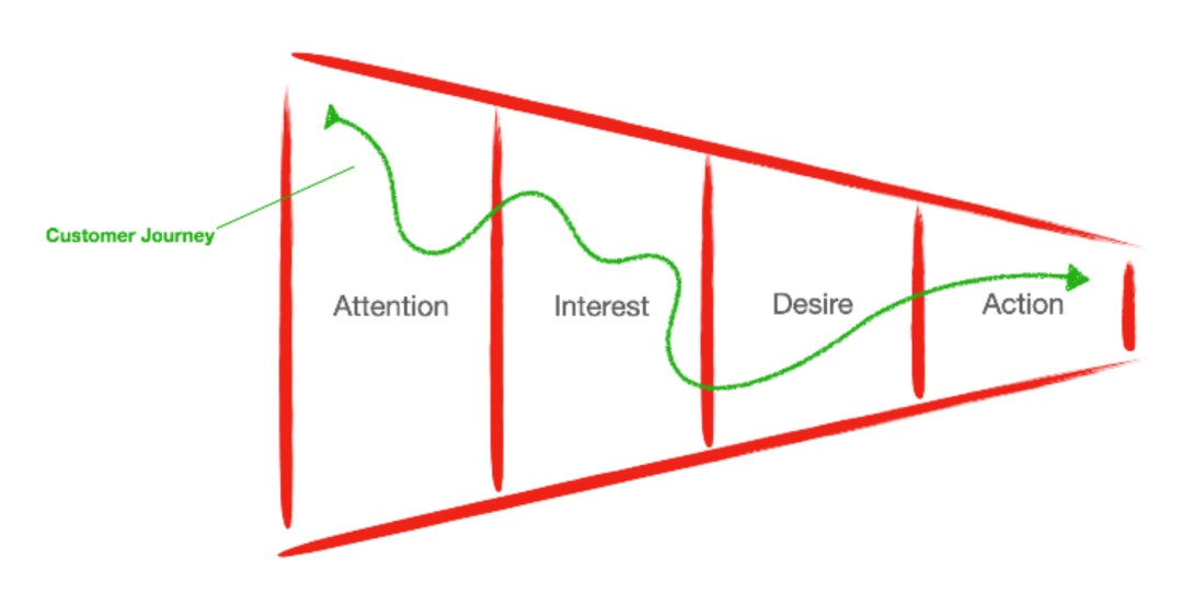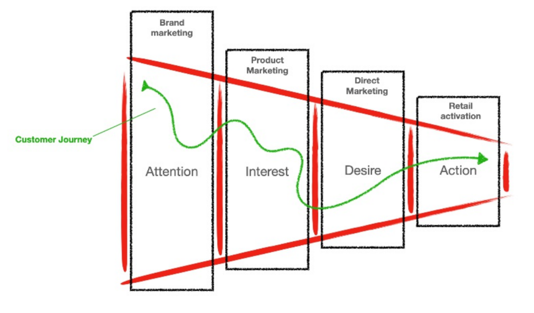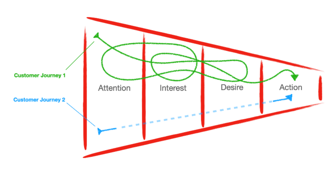 在过去,营销分区看上去是非常合理的选择:线性销售漏斗与现实中的用户购买流程一一对应,因此将营销分为四个阶段,Attention,引起注意;Interest,诱发兴趣;Desire,刺激欲望;最后为Action,促成购买。