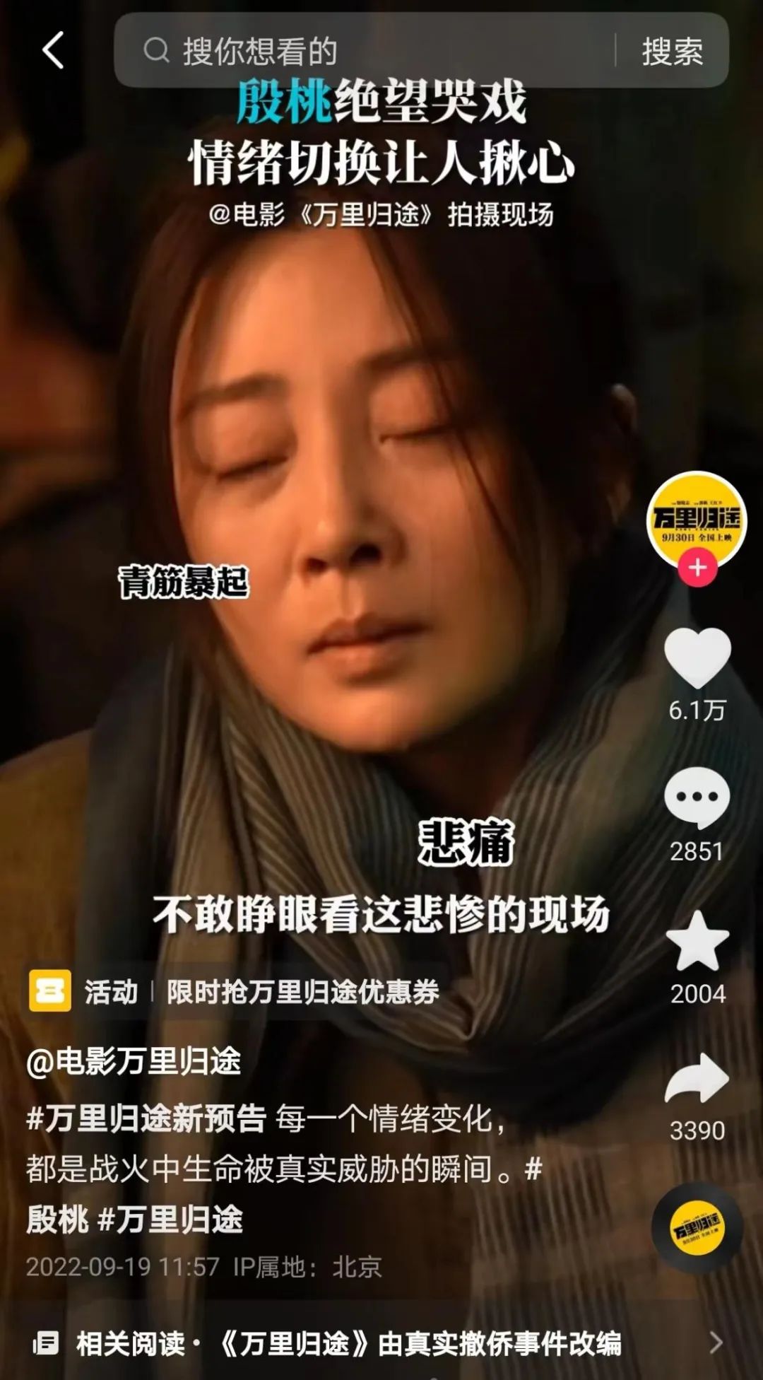 据统计,《万里归途》在抖音账号目前共发布超200条物料视频,包括电影花絮、演员采访、观众采访、表情包玩梗等;并且在B站上,开启“见证万里归途撤侨之路”二创征集活动。这些持续性的动作,在观众的情绪引导、触达效果上较为明显。