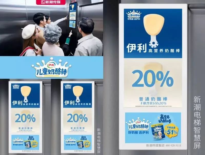 2022年,伊利与新潮传媒达成战略合作,基于“干酪含量高达51%”的核心优势,展开社区电梯媒广告投放。儿童奶酪棒是较为特殊的一类产品:购买者是家长,而体验者是孩子,消费者身份并不统一。这就决定了做他们的产品传播,品牌必须同时影响到这两类消费者。