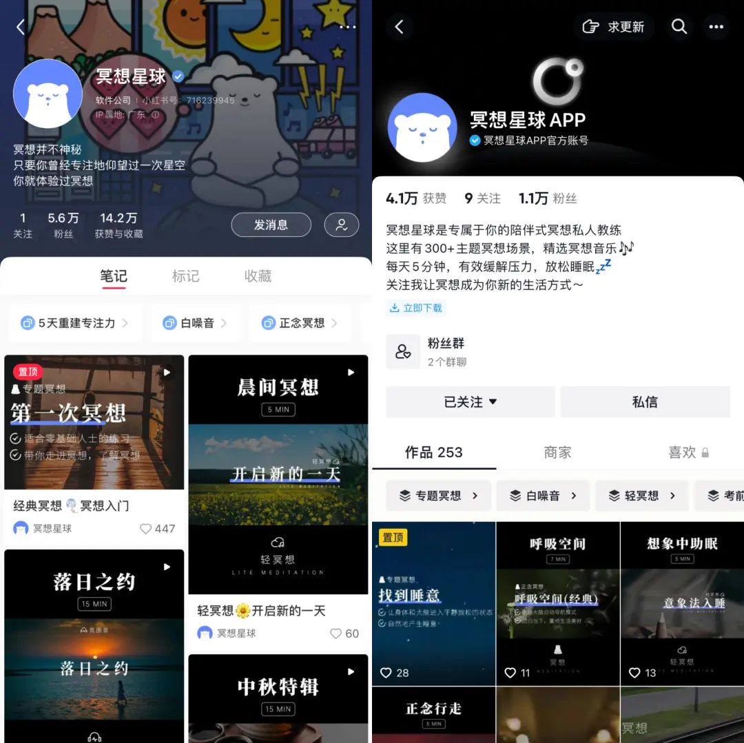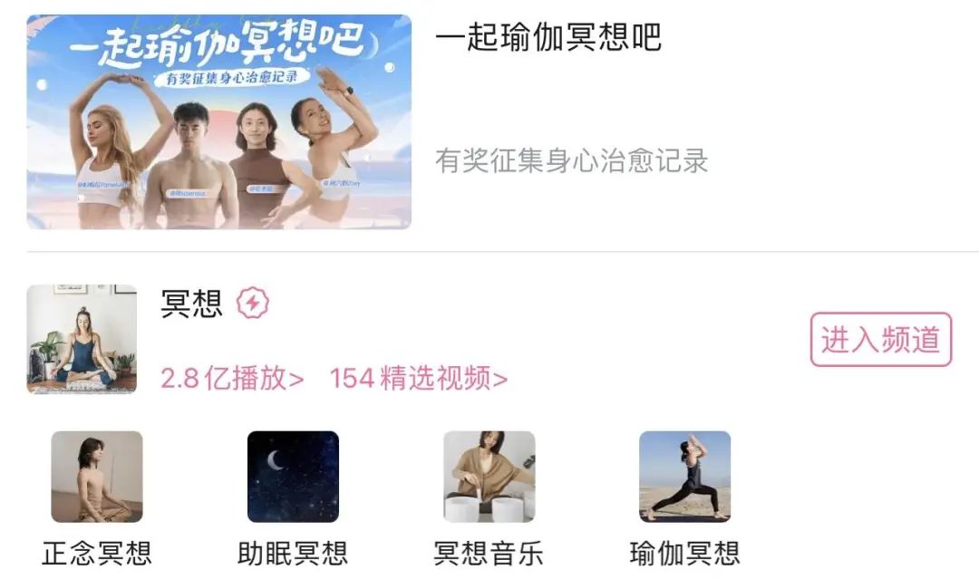 新红数据显示,相比去年上半年,“冥想”相关笔记数量在今年上半年增长2.3倍,累计数量超过43万篇。据新站数据,“冥想”相关视频数量达到3.26万,播放量总计达2.8亿次,B站将“冥想”与瑜伽内容进行整合,推出专题栏目。