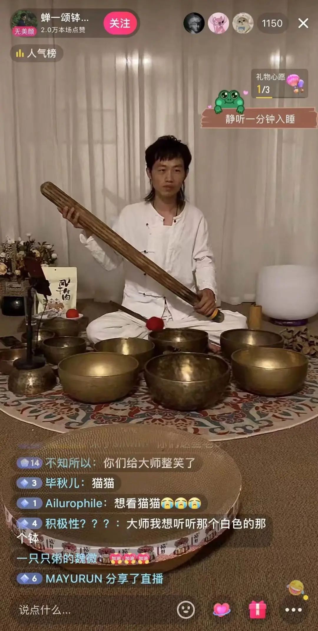 “12点只是刚开播热热场子,颂钵经常直播到凌晨两三点,那会观众才多呢,两三千人热闹的很”, 北北看颂钵直播近一个月,俨然成了一个熟客,在这之前,她对颂钵了解很少,最初点进直播间只是冲着“助眠减压”的主题。