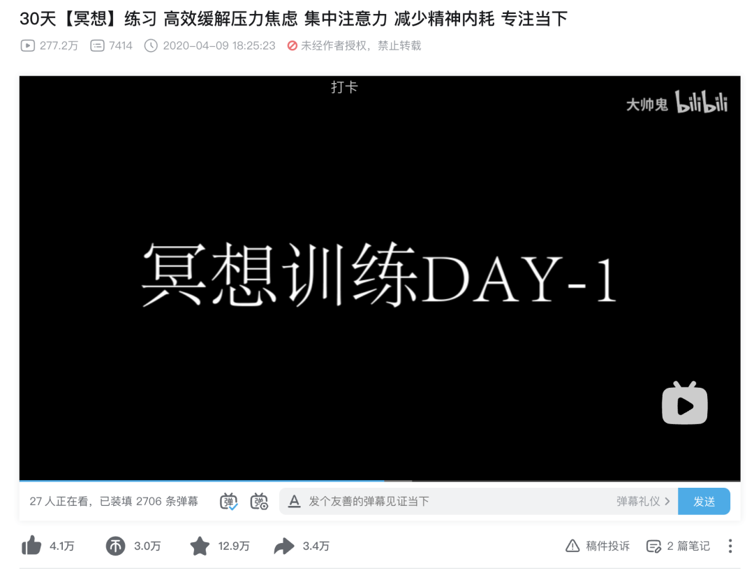 以B站播放量最高的一组冥想视频合集举例,虽然仅有一个固定画面,但观看次数达277.2万,弹幕中不时出现“打卡”的留言。